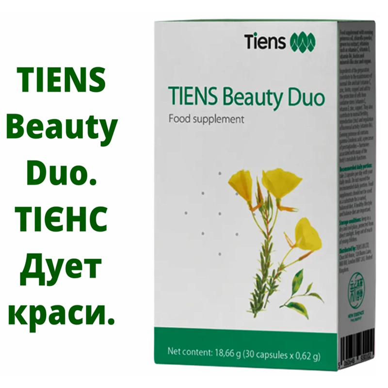 ТІЄНС Б’юті Дуо. – Густе блискуче волосся. Міцні нігті. Ідеальний гормональний баланс. Секрет – давно відомий у китайській медицині – унікальна двофазна формула. Зовнішня капсула: масло енотери – Вирівнює менструальний цикл. Зменшує симптоми ПМС та менопаузи. Підтримує пружність та зволоженість шкіри. Уповільнює процеси старіння. Покращує стан волосся та нігтів. Внутрішня капсула: порошок хлорели – детокс і баланс. Очищає організм від токсинів. Зміцнює імунітет. Нормалізує рівень цукру в крові. Ціна 1317,00 грн.
